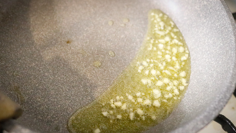 - フライパンにオリーブオイルとニンニクを入れ、香りが立つまで炒める。