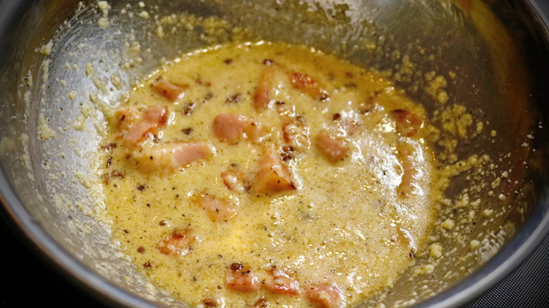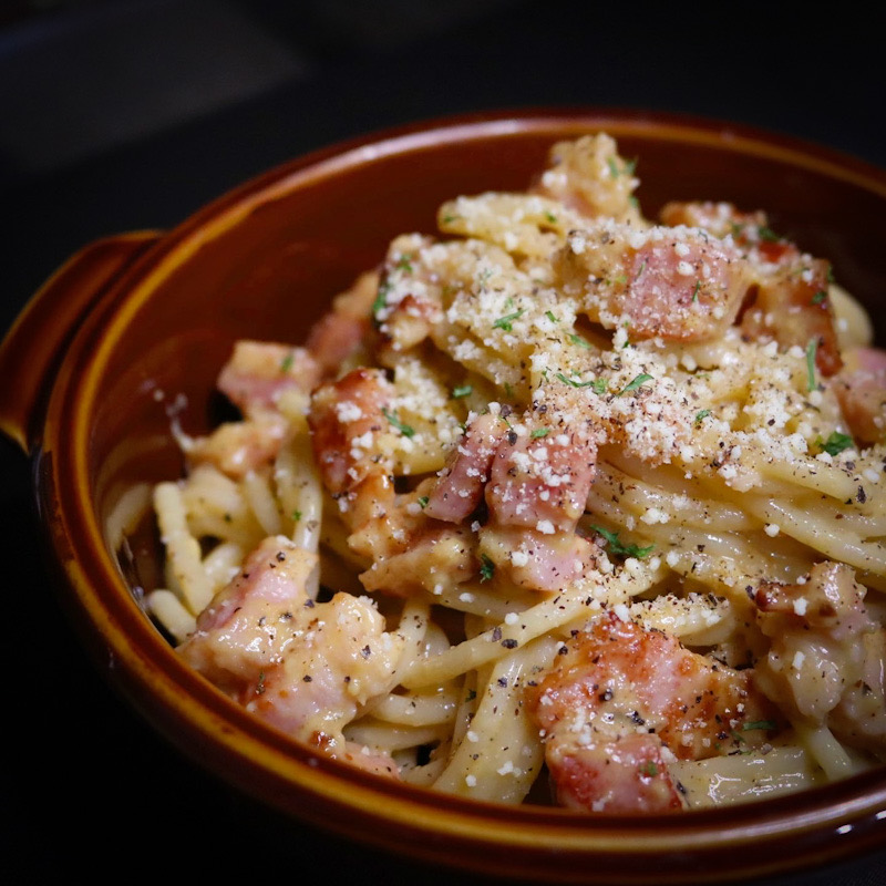 第二次世界大戦後、ローマにアメリカ軍が持ち込んだベーコンや卵を使って作られたパスタソース。本場ローマではグアンチャーレ(豚の頬肉の塩漬け)、ペコリーノ・ロマーノ(羊のミルクで作ったチーズ)を使うのが一般的。