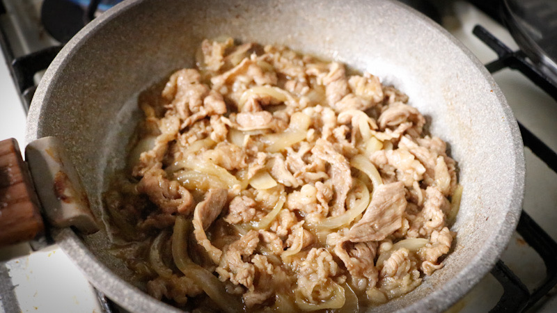 - フライパンに牛肉を加え、焼き色がつくまで炒める。