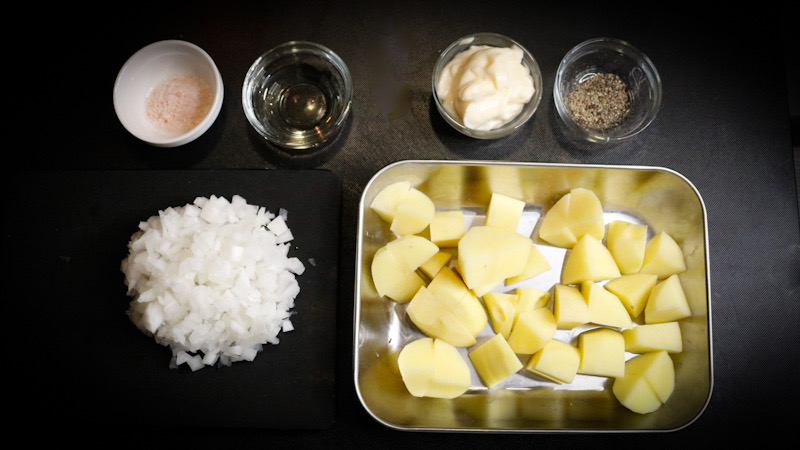 - じゃがいもの粗熱がとれたら、玉ねぎ、マヨネーズ、黒こしょうを入れて全体に絡まるように混ぜたら完成です。